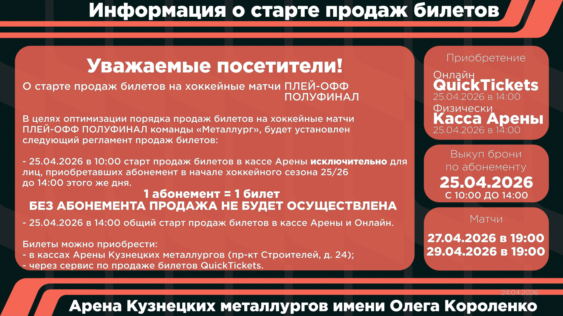 Уважаемые посетители Арены Кузнецких металлургов имени О. Короленко и болельщики команды «Металлург», в связи со сложившейся текущей ситуацией по реализации билетов на Плей-Офф, предоставляем следующую информацию: