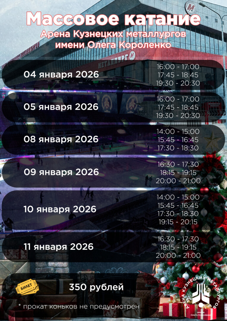 Вход на массовое катание будет производится возле 11-12 сектора Арены Кузнецких металлургов имени О. Короленко.